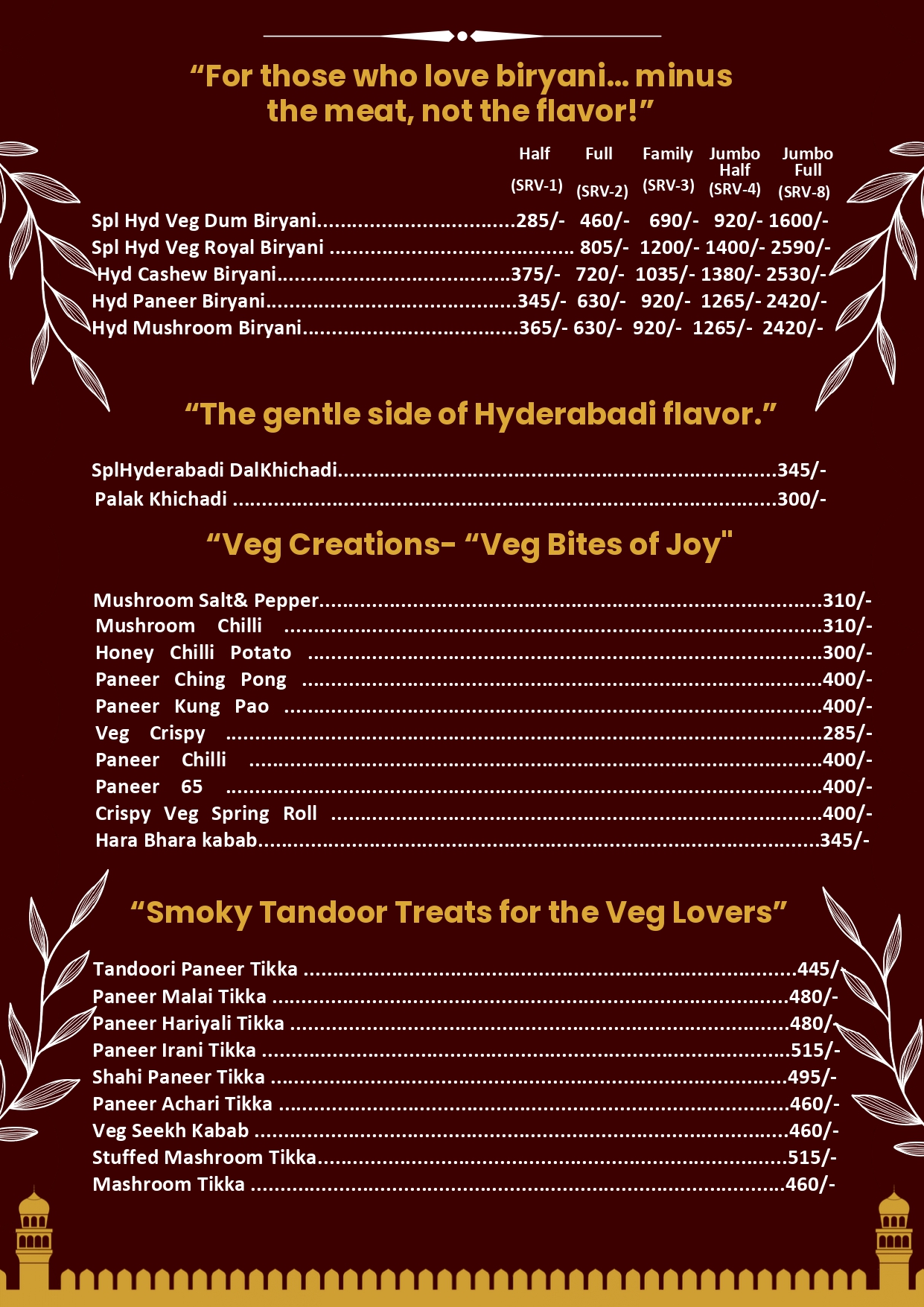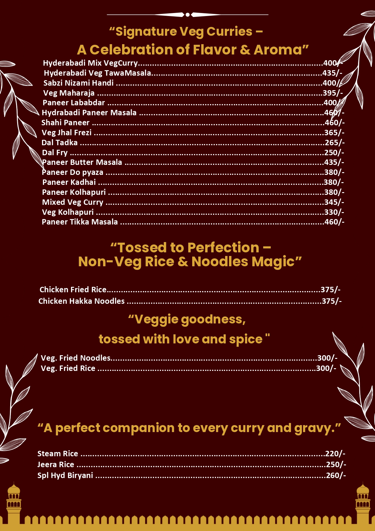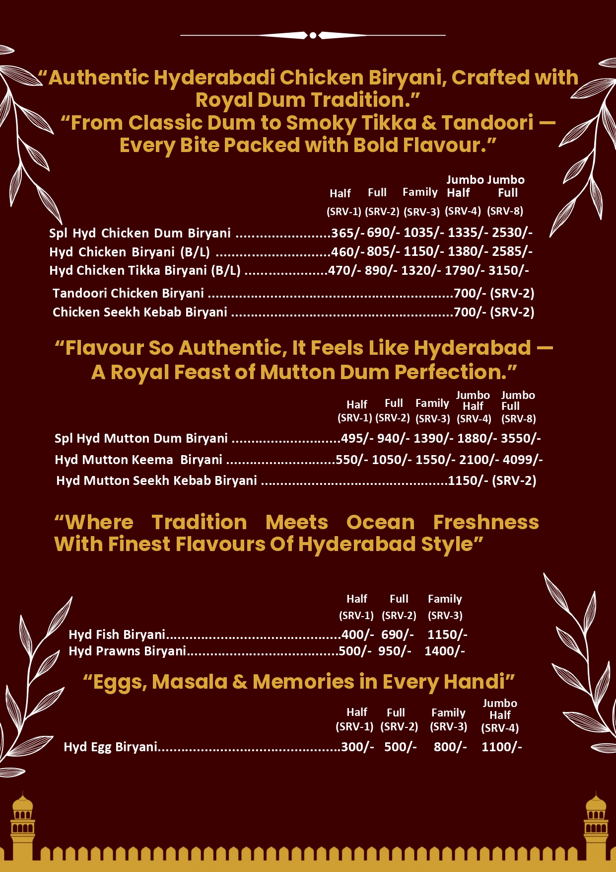 To provide an authentic Hyderabadi dining experience that transports our guests to the royal courts of the Nizams, while maintaining the highest standards of quality, service, and hospitality.
