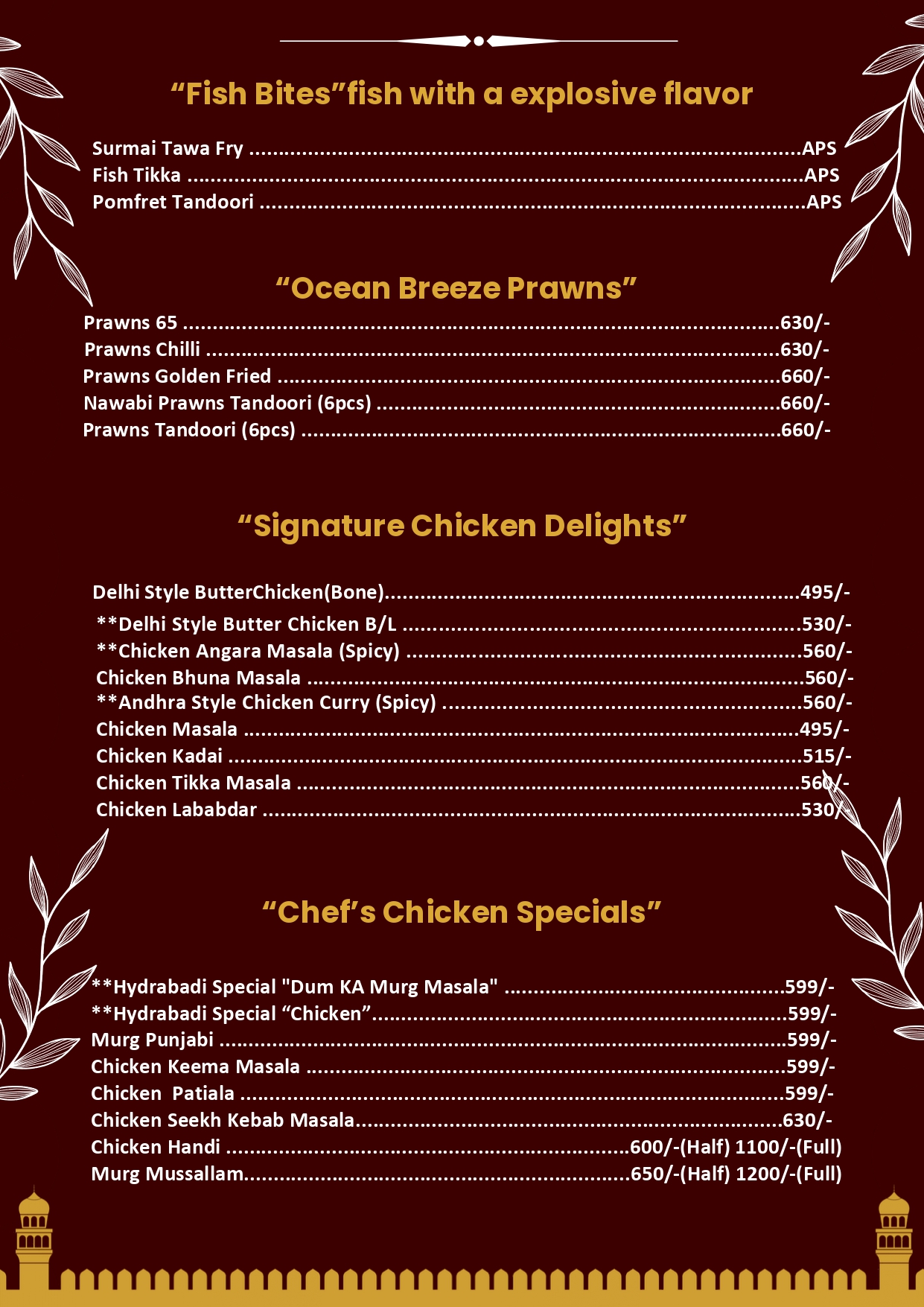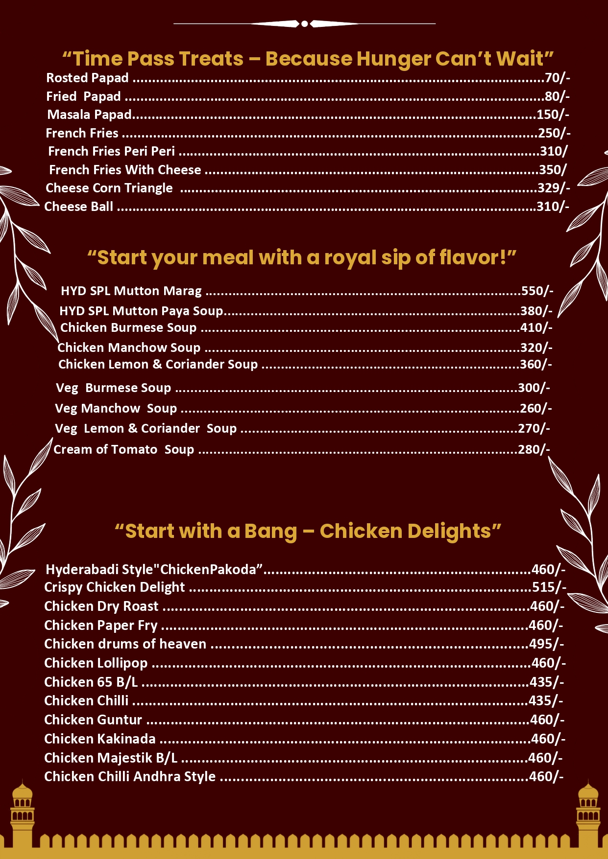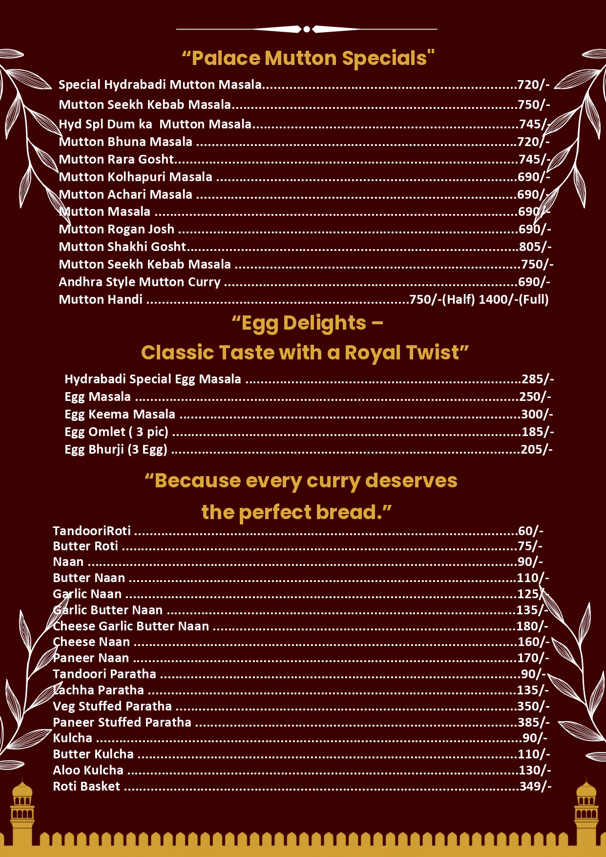 To provide an authentic Hyderabadi dining experience that transports our guests to the royal courts of the Nizams, while maintaining the highest standards of quality, service, and hospitality.