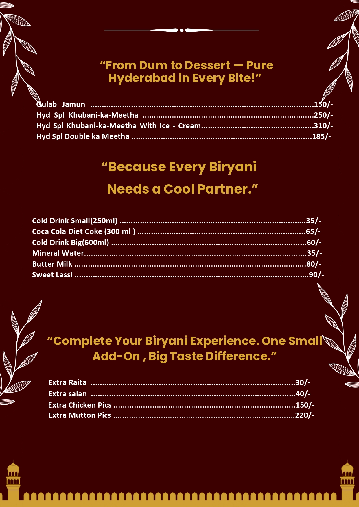 Our master chefs specialize in authentic Hyderabadi cooking methods, using carefully selected ingredients and traditional spices to ensure every bite delivers royal flavor and unmatched quality. Whether you're enjoying a family dinner, celebrating a special occasion, or simply craving authentic biryani, we aim to create a memorable dining experience every time you visit.